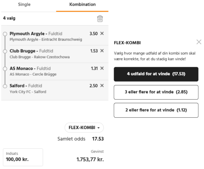Skab din egen kombinationsvæddemål, og er du i tvivl om, hvorvidt alle dine valg går hjem, kan du bruge Flex Kombi-funktionen til at vælge forskellige odds afhængigt af, hvor mange valg du har mest fidus til. For at lave en flexkombi, tryk på menuen "FLEX-KOMBI" for at åbne en sektion, hvor du kan angive antallet af valg